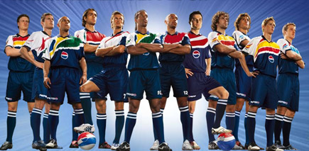 La refresquera le pagó a un verdadero dream team para que le representara. Para la soberbia constelación rompe-redes, desarrolló un uniforme y un vistoso logotipo. La imagen del equipo, éxtasis del soccer, está integrada por jugadores como Roberto Carlos, Ronaldinho, Beckham, Raul y Lampard, y está dando la vuelta al mundo a velocidad de globalización, lo que quiere decir que en menos de lo que se lee este post, ya fue y vino.