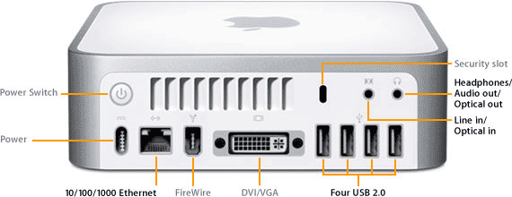 El fenomenal aparatito apenas mide 5.08 cm de alto, 16.51 cm de ancho y profundidad, y pesa escasamente ¡1.31 kg! Viene equipado con 4 slots USB 2.0, un puerto FireWire, conexión ethernet, salida de video DVI/VGA y Bluetooth 2.0.