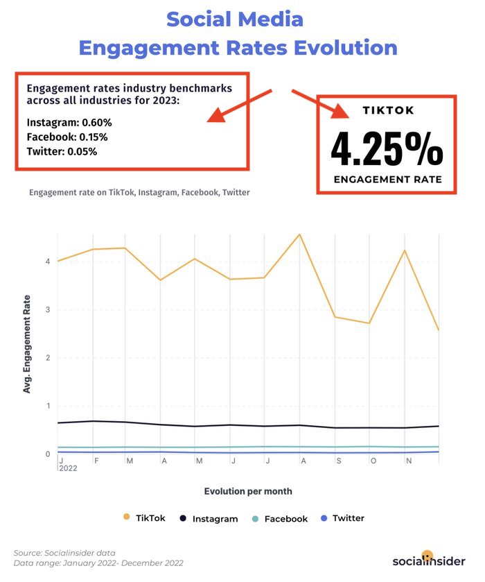 De acuerdo con Social Insider, el engagement en redes sociales está por los suelos, no llegando muchas veces ni al 1%. Incluso, la estrella actual del social media, TikTok, ha comenzado desde hace un tiempo a mostrar una caída en esta métrica. Hoy, apenas es del 4.25, es decir que por cada 100 personas que ven un contenido, apenas 4 interactúan.