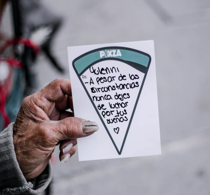 Una vez que terminas tus alimentos, junto a tu cuenta, te entregarán un papel con el dibujo de una rebanada de pixza. La invitación es que escribas un mensaje para una persona en situación de abandono que recibirá una Pixza gratuita, como parte de los esfuerzos sociales de la marca.