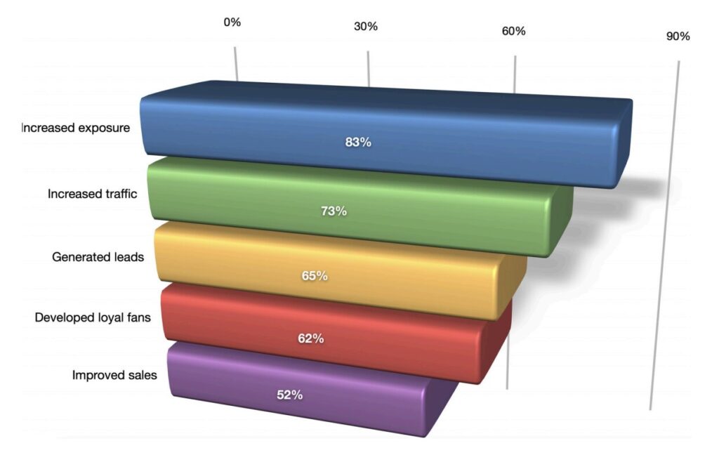 83% de todas/os los especialistas en marketing indicaron que sus esfuerzos en las redes sociales han generado más exposición para sus negocios. De modo que el principal beneficio, sin lugar a dudas es que las redes sociales proveen awareness (presencia de marca).