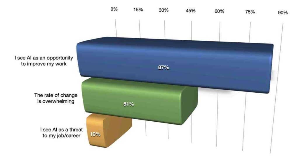 Interesante es ver que pese a las decenas de casos donde es posible ver los riesgos de la IA, las y los profesionales del marketing, ven en ella más oportunidades que amenazas, incluso para sus empleos. Aunque ojo, la mitad se siente abrumado por ella. De cualquier manera, parece que ¡Larga vida a la IA…! hasta que llegue Skynet (LOL!).