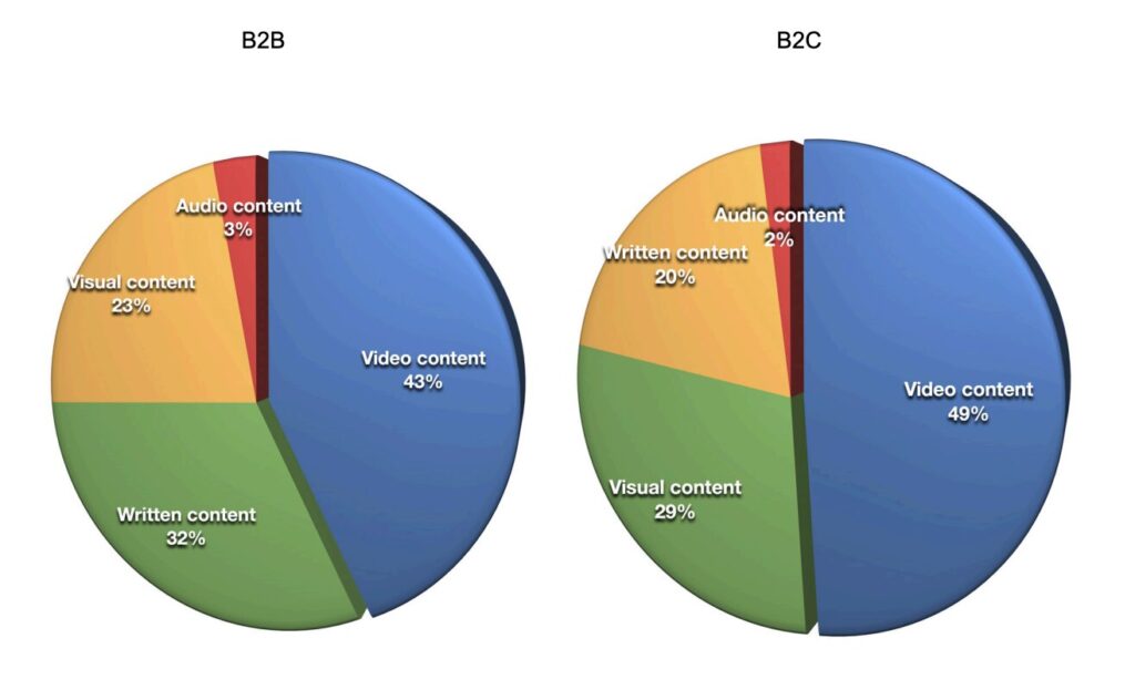 Si bien el contenido más importante para profesionales del marketing es el video, el segundo lugar se lo lleva el gráfico en el caso B2C y el escrito en el caso B2B, y esto es lógico porque en B2B es muy relevante mostrar expertise, y esto se logra bien con el contenido escrito en Linkedin.