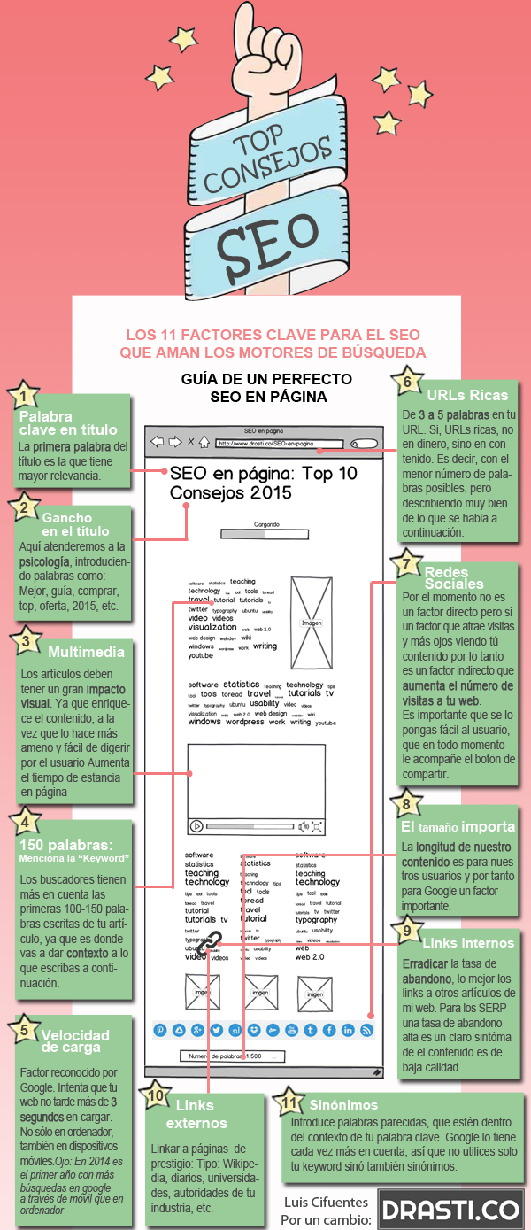 Los trucos de SEO en página para mejorar el posicionamiento de tu web (cortesía de Drasti.co) son sencillos y nada técnicos. Aquí abajo puedes encontrar una infografía para ver toda la información de un solo vistazo.