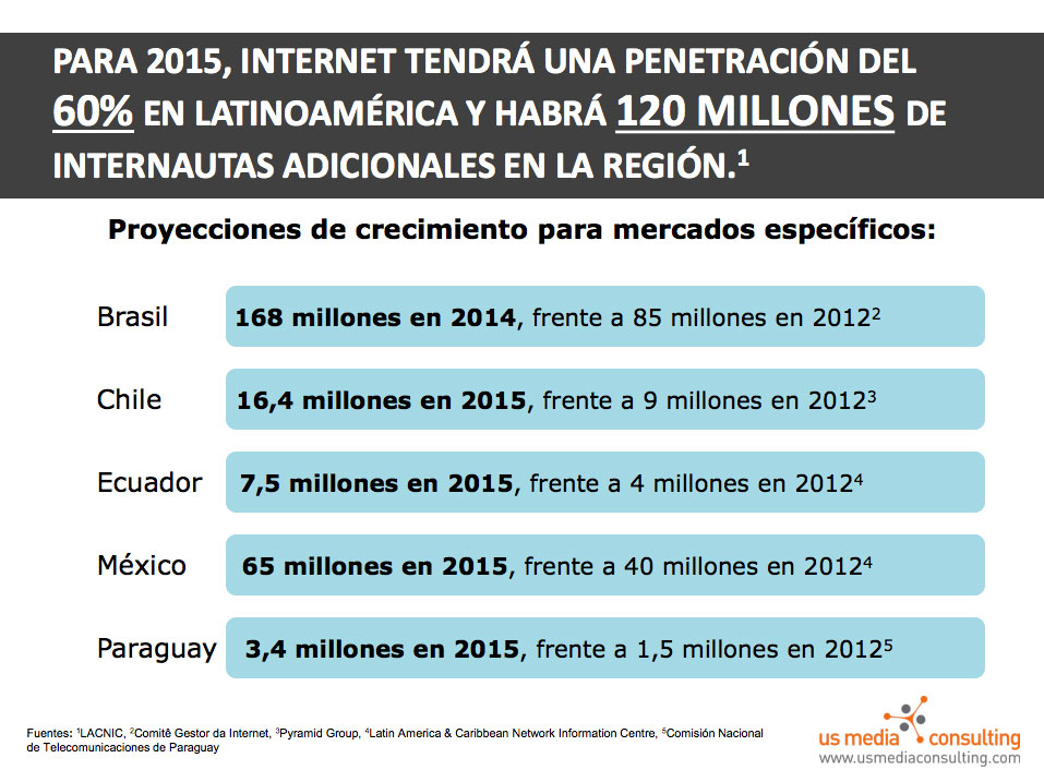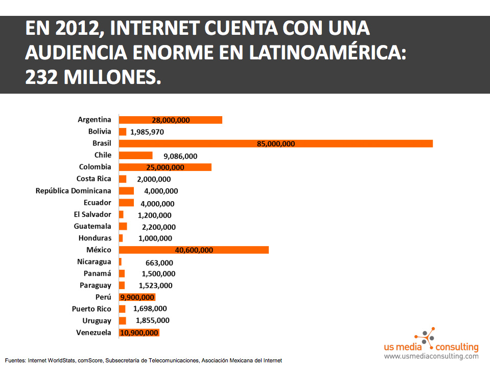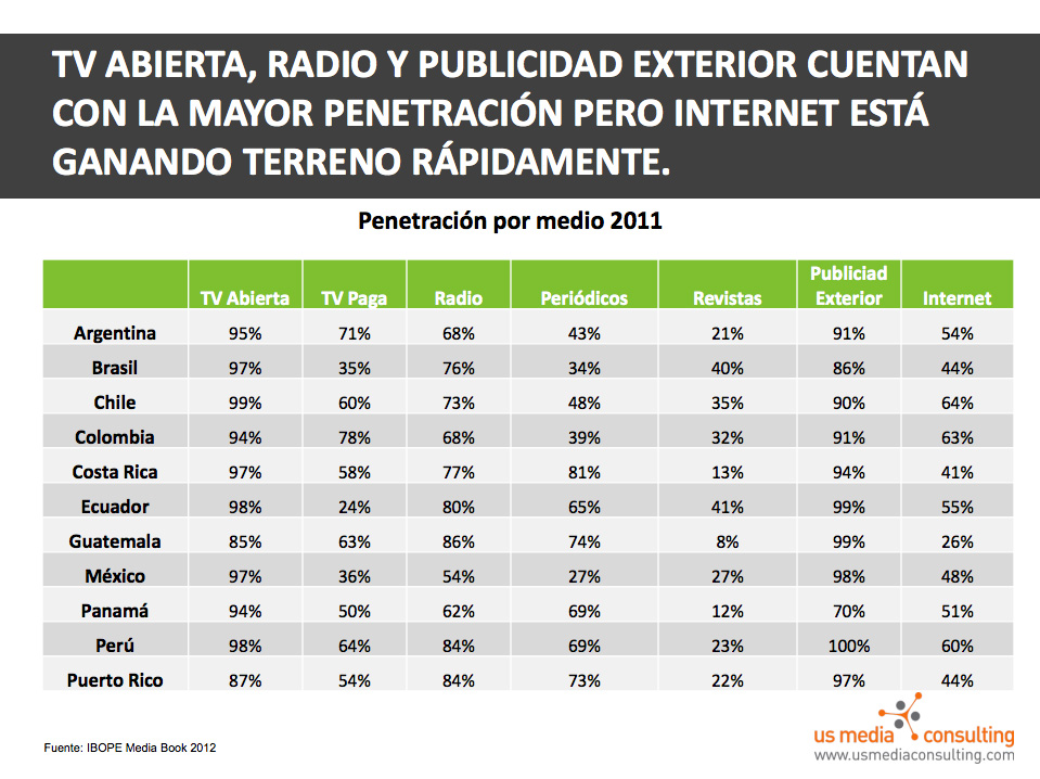 Me escriben de US Media Consulting para compartirme su estudio de medios para Latinoamérica. En él se ven datos interesantes que vale la pena compartir, no solo por el hecho de conocerlos sino para tomar mejores decisiones sobre nuestras acciones e inversión en internet.