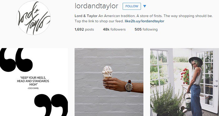 16. Colabora con influencers. Lord & Taylor colaboraron con 50 fashionistas influyentes en Instagram. Cada una publicó una foto usando el mismo vestido. El vestido se vendió el fin de semana pero el objetivo de la marca fue el lanzamiento de la colección Design Lab. Aquí puedes ver todas las fotos. Así se veía el feed de Lord & Taylor: