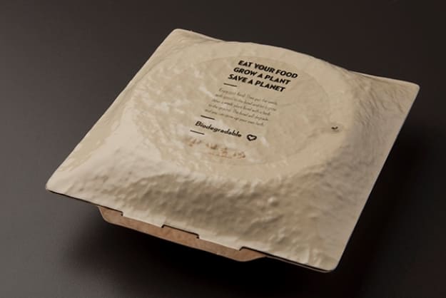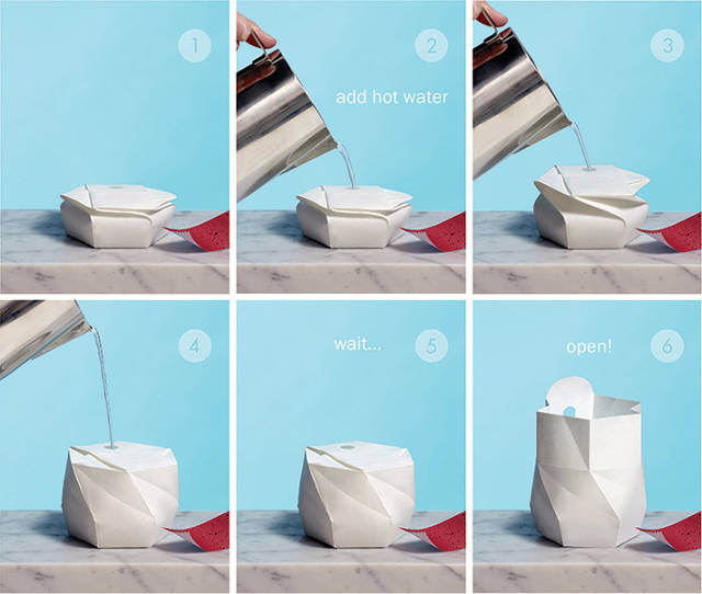 Hecho de materiales naturales, al verter agua caliente, el paquete reacciona al calor y pasa de ser un embalaje comprimido a un recipiente.