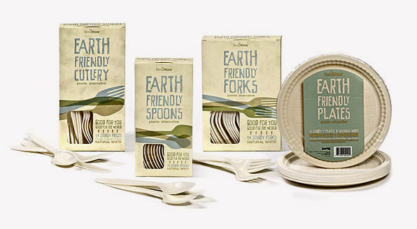 Cucharas, tenedores y cuchillos biodegradables. La tinta en el envase es biodegradable, como todo lo que se imprime.