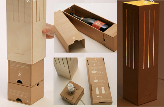 Innovadora lámpara que elimina embalaje. Cuando la lámpara está montada, el envase se convierte en el color de la bombilla y la lámpara que contiene. Este ejemplo inteligente de doble uso muestra cómo el uso de los envases puede ser optimizado.