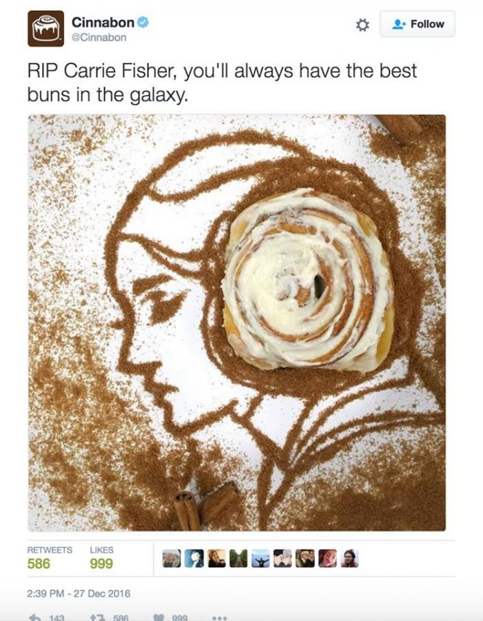 Antes de hacer Newsjacking, tienes que entender que eso implica un riesgo. Si no nos crees pregunta a Cinnabon qué luego de la muerte de Carrie Fisher quiso promocionar sus roles así y la gente se le fue encima.
