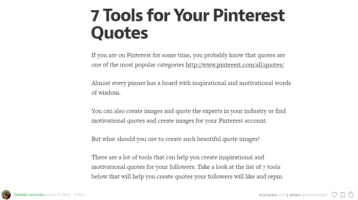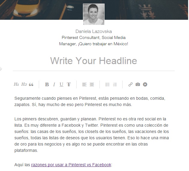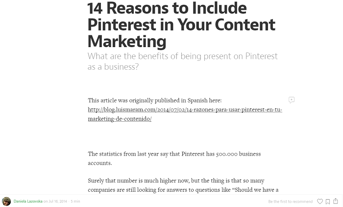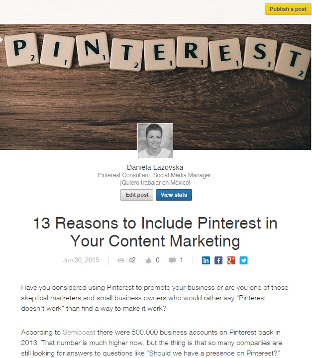 Escribí este post sobre los beneficios por tener presencia en Pinterest. Luego lo traduje en inglés para publicarlo en Medium. Unos meses después de actualizarlo lo publique en LinkedIn y luego lo compartí en los tableros en Pinterest.