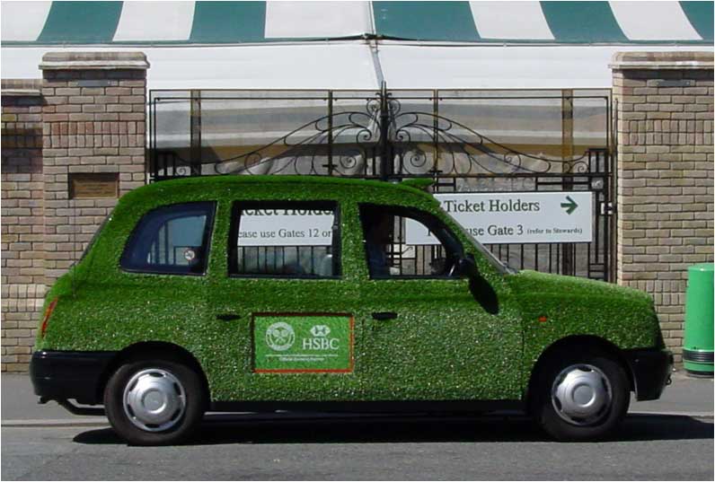 Para publicitar su patrocinio del torneo de tenis de Wimbledon, HSBC forró varios taxis con pasto sintético; la superficie verde es el sello distintivo del certamen inglés.