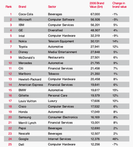 En cooperación con BusinessWeek, Interbrand presentó su ranking anual de las mejores marcas a nivel mundial de acuerdo a su valor. Interbrand afirma «en una certera apreciación» que las marcas son ventajas económicas y como tales deben ser administradas.