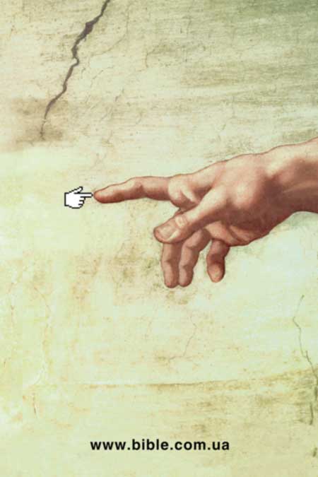Un anuncio interesante para promocionar la Biblia online. La sutitución de la mano de Adán por el cursor de «manita» es brillante. Sólo un detalle: la obra maestra de Miguel íngel no une los dedos de Creador y creado, sino que simplemente los acerca a una distancia mínima para acrecentar al máximo el punto de tensión. Cuando se tocan, dicha tensión desaparece.