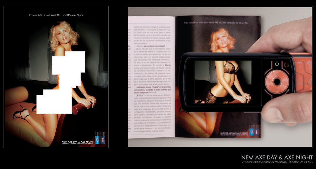 axeUna ejecución tremendamente sencilla pero poderosamente creativa. Para lanzar el binomio de desodorantes Axe en Uruguay, (Day & Night), Lowe Ginkgo diseñó este anuncio incompleto que aparecía en una revista… una chica aparentemente desnuda, pero con recuadros blancos en sus zonas más íntimas.