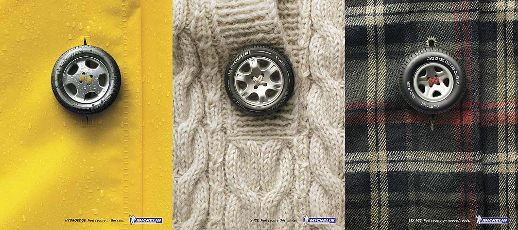 Genial trío de impresos para Michelin; las llantas simulan botones de diferentes prendas de vestir, cada una representando distintas condiciones de manejo. Gran idea que elimina los gastos de una onerosa producción en tres locaciones distintas. Michelin para suelo mojado, con nieve o accidentado. Definitivamente una campaña extraordinaria.