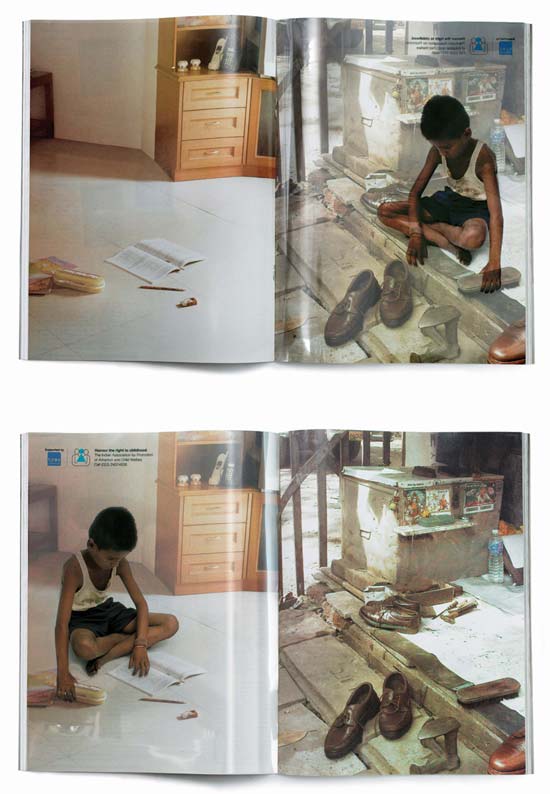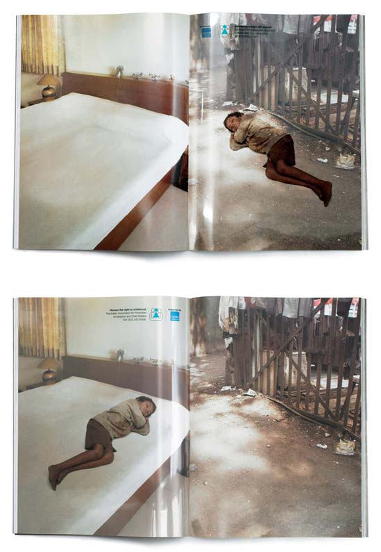 Esto es de lo mejor que he visto en marketing social. Impresos para revista realizados a doble página; sin embargo, hay en medio de ellas, una hoja transparente (alguna especie de acetato), impresa con la imagen de un niño que, dependiendo si lo vemos como página izquierda o derecha, se ubica viviendo en la calle o en una casa. Obviamente el texto se puede leer correctamente cuando el niño aparece en un hogar.