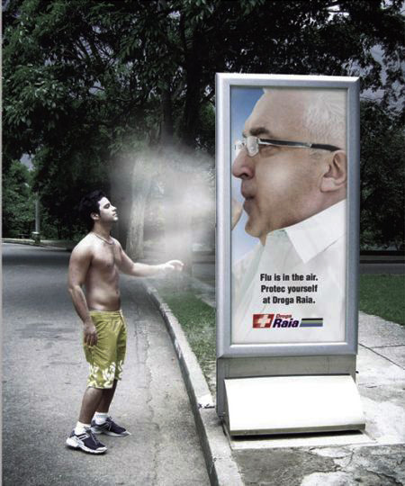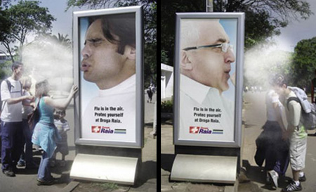 En el Ibirapuera Park de la ciudad brasileña de Sao Paulo, se aprovecharon los mupis para colocar posters de forma tradicional con el copy: «La gripe está en el aire. Protégete con Droga Raia«. Hasta allí todo sería común, casi aburrido; sin embargo, la magia comienza cuando el paso de algún peatón coincide con una emanación del mupi que simula ser un estornudo.