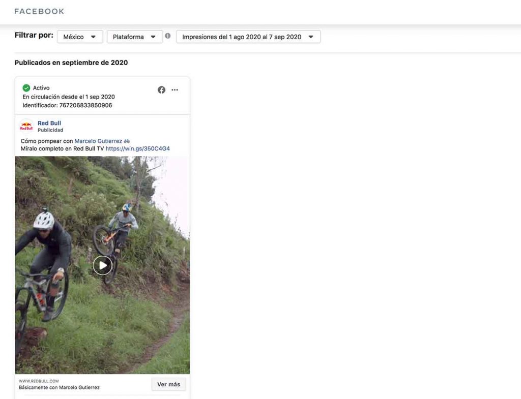¿Y Red Bull no publica anuncios? Nos fuimos hasta su página de Facebook a hacer un análisis de transparencia. En el último mes solo tenían registrado uno… ¿de ventas? No. Más contenido diseñado para su audiencia.