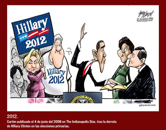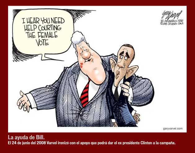 Dos diseños de cartones para la campaña política de Obama en la contienda presidencial estadounidense. Ambos se refieren al apoyo recibido por el clan Clinton al candidato demócrata. En medio de la crisis económica mundial es bueno ver que aún podemos esbozar una sonrisa devenida del marketing político.