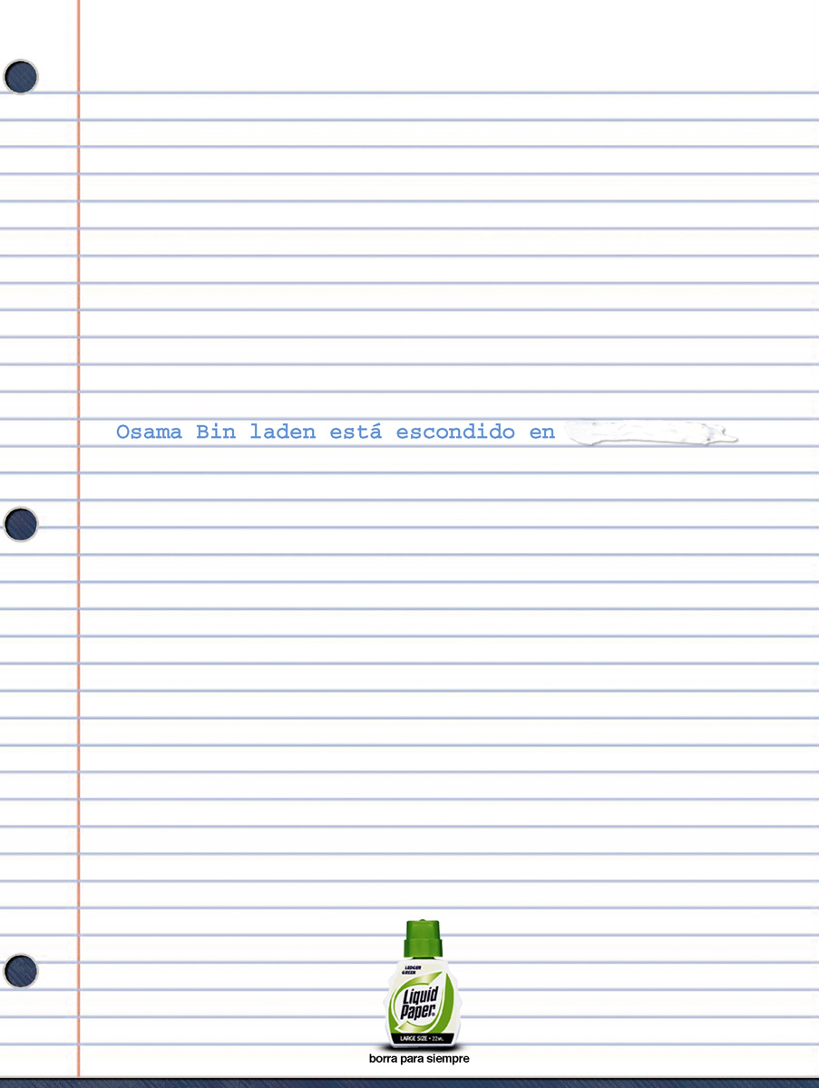 Finalmente, Liquid Paper usó con mucho humor sardónico, el hecho de que el mundo no pudiera hallar el escondite de Osama durante muchos años. Sin hacer uso de la imagen del personaje del mundo árabe, logró una publicidad efectiva y muy interesante.