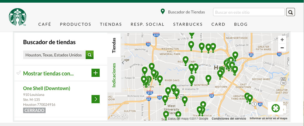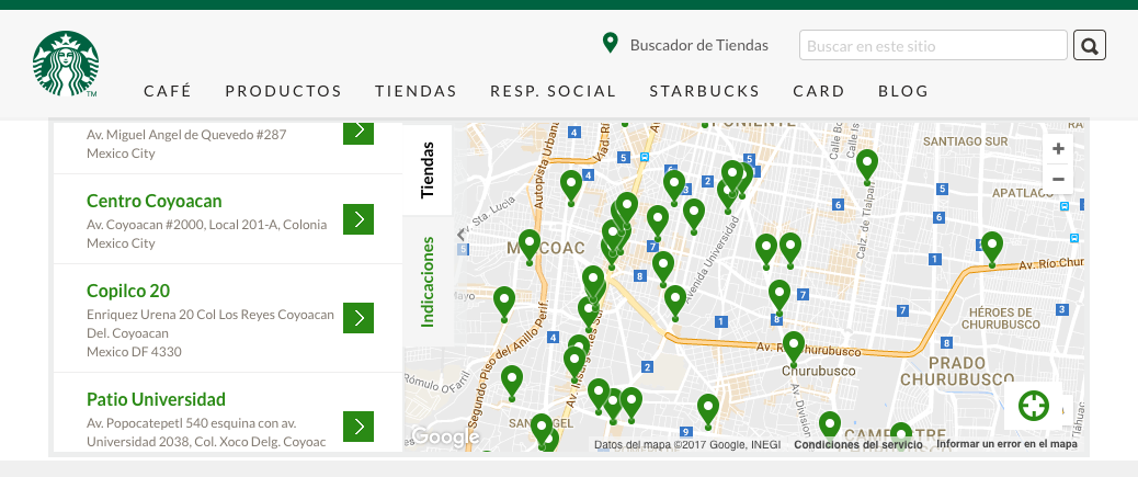 El sitio web de Starbucks cuenta con un localizador de sucursales que muestra todos los puntos de venta en cualquier lugar del mundo y sus horarios de atención… Mira México…