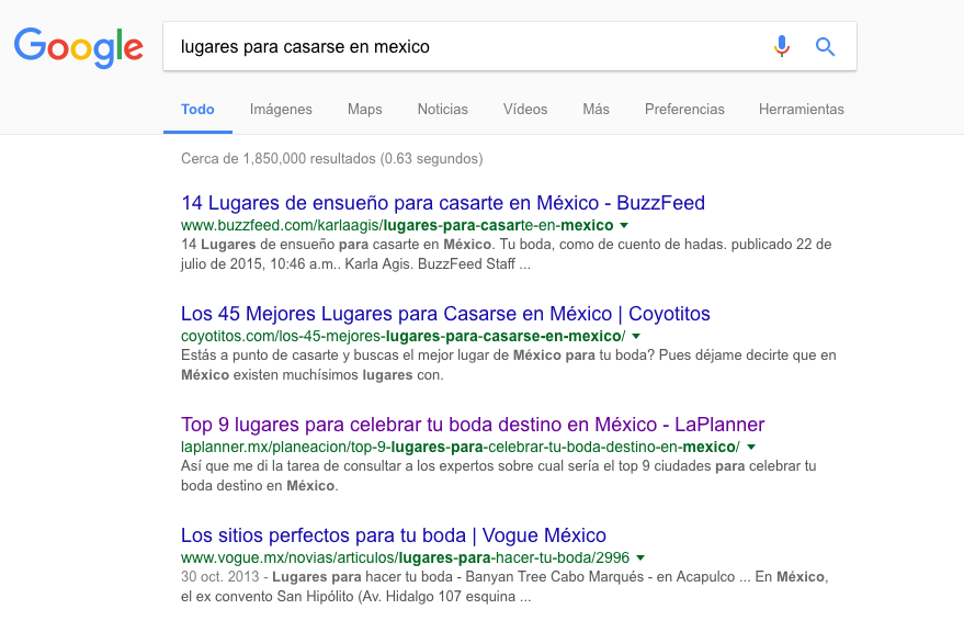 Esta planeadora de bodas, por ejemplo logró colocarse dentro de los primeros resultados de la búsqueda: lugares para casarse en México. Su contenido es el número 3. Lo que quiere decir que estadísticamente se está quedando aproximadamente con el 10% de los clicks de cada vez que se googlea esto. Nada mal ¿no? (El primer resultado se lleva alrededor del 30% y el segundo casi el 15%).