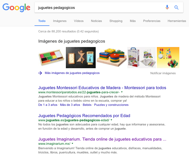 Juguetes Montessori es una juguetería y no aparece con esta búsqueda genérica; sin embargo ha logrado apoderarse de la primera posición en búsquedas para juguetes pedagógicos.