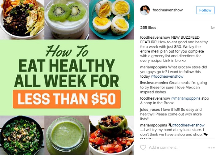 En este Ejemplo Food Heaven Show comparte contenido publicado por BuzzFeed sobre un plan de comida que ellos prepararon e incluyen «Enlace en bio».