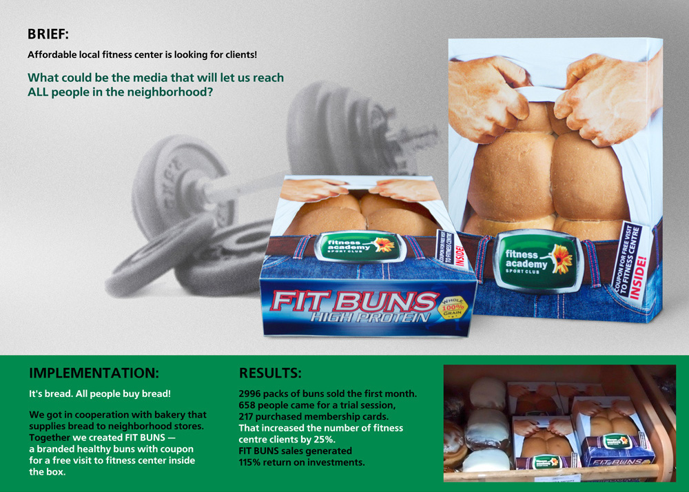 Para muestra esta ejecución de un gimnasio en Ukrania, quienes en conjunto con una panadería local, desarrollaron estos «bollos saludables» que gracias al empaque, simulaban ser un abdomen bien marcado. Por supuesto que el tremendo diseño en anaquel robaba miradas y capturaba atenciones. La caja anunciaba la inclusión de 2 cupones para visitar el gimnasio.