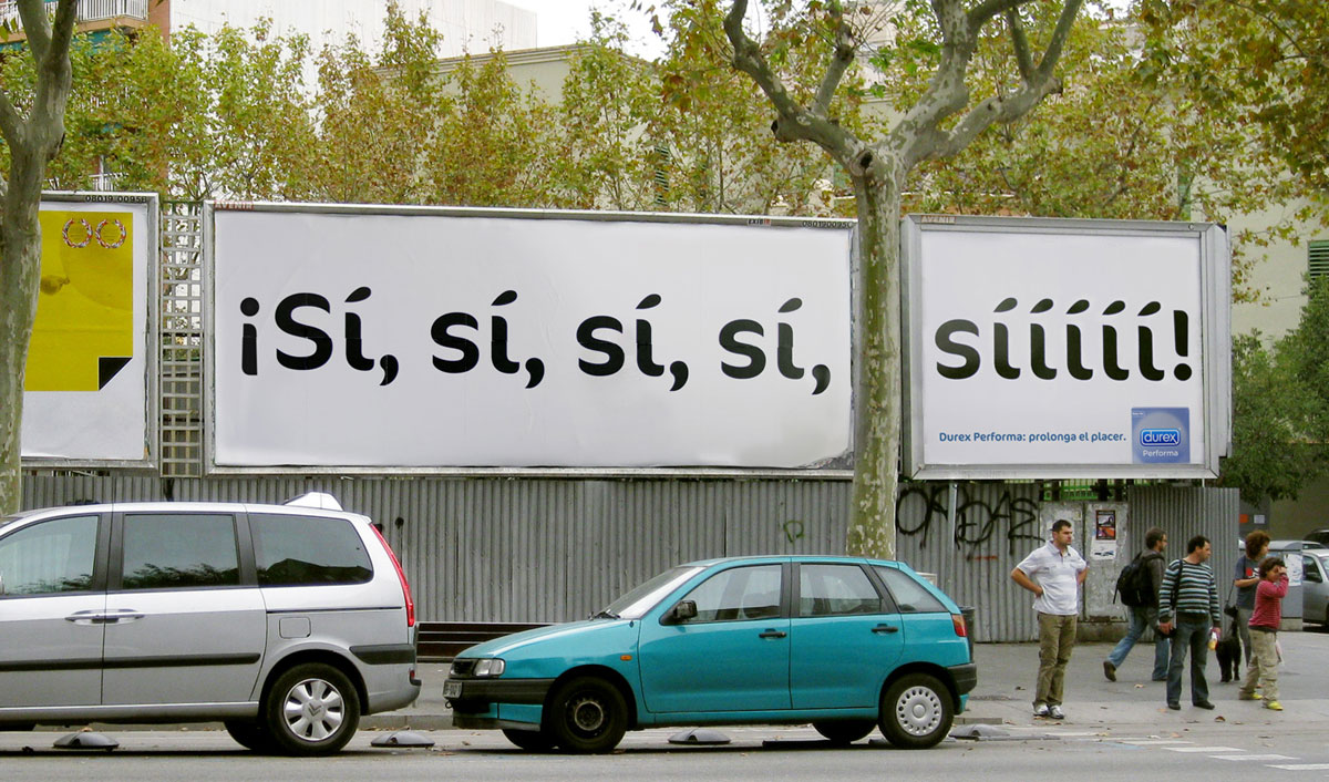 Después de haber hecho mi catarsis, traigo un anuncio sencillo, casi simple, de hecho. Se trata de un buen aprovisionamiento de vallas para expresar una promesa básica: Durex (condones) prolonga el placer.