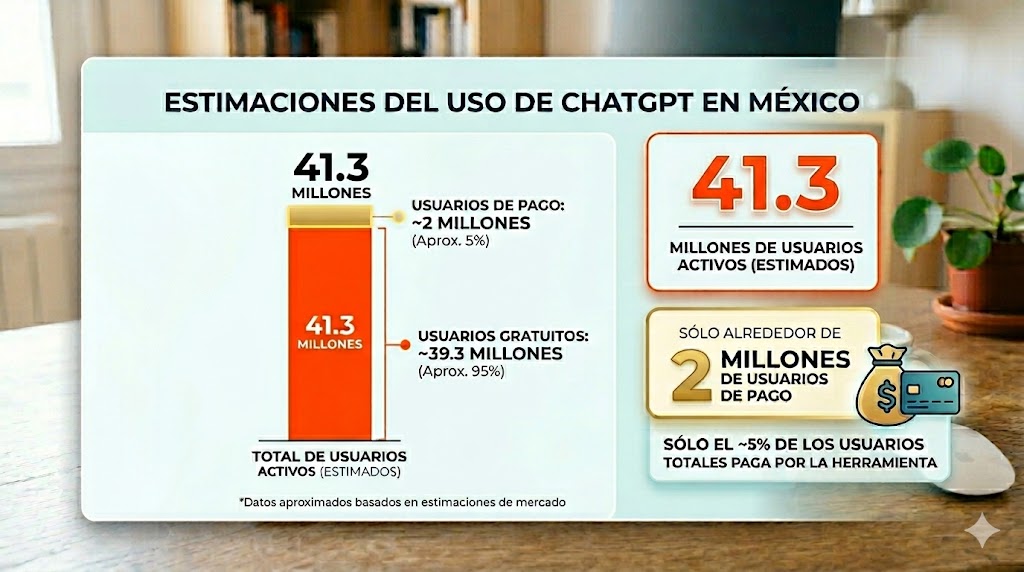 Para inicios de marzo de 2026, se estima que en México existen aproximadamente 41.3 millones de usuarios activos de ChatGPT.