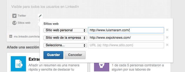Si quieres incluir un enlace a tu blog, en lugar de elegir el ancho de texto estándar de LinkedIn, personalízalo para incluir palabras clave que indican de lo que trata tu sitio o tu blog. Cada perfil puede mostrar hasta tres enlaces a sitios web de este tipo y todos pueden ser personalizados mediante la edición de tu perfil Perfil >> Editar Perfil >> Información de contacto y haz clic en cada sitio que quieras modificar.