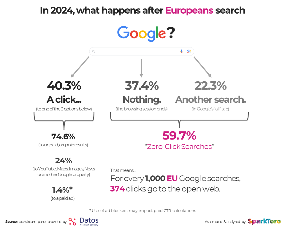 Hoy más del 55% de las búsquedas no generan un clic en Google. Aquí las gráficas de lo que sucede tanto en América como en Europa: