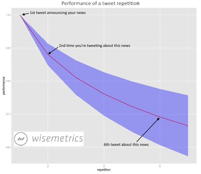 De acuerdo con un estudio de Wisemetrics, enviar un mismo tuit en varias ocasiones no es tan mala idea, ya que si bien en la 2a ocasión no tiene el mismo impacto en cuanto a engagement, sí logra un 86% del performance. Aún después de 6 envíos, el tuit aún tiene un 67% de funcionamiento ¿Por qué sucede esto? Personalmente pienso que es por la vida de los tuits ¿Cuánto vive un tuit? Averígüenlo por ustedes mismos, abran su timeline y vean la velocidad. Estadísticamente 20 segundos es un aproximado; de modo que es extremadamente difícil que alguien vea que posteaste el mismo tuit dos o tres veces en un día… a menos que te estén stalkeando ¿verdad?