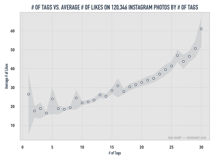 Max Woolf analizó más de 120.000 fotos de Instagram y encontró que las fotos que utilizan el máximo permitido de hashtags (30) recibieron tres veces más likes que las fotos con pocos hashtags. Instagram es de las pocas redes sociales que aún funcionan de forma aceptable en orgánico y el uso de hashtags es una excelente forma de aprovecharlo.