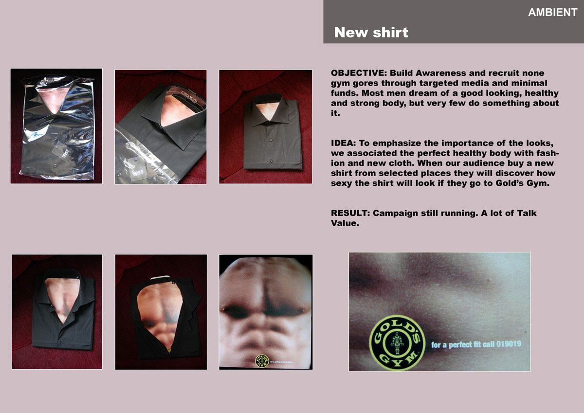 La ejecución, tan simple como brillante, consistió en sustituir el soporte tradicional dentro de los empaques de las camisas, por uno con la impresión de un musculoso torso. De esta forma, cuando algún cliente sacaba la prenda para probársela, al desabotanarla veía el atlético cuerpo, connotando obviamente la forma en que uno se ve con la suma de un buen físico y la moda.