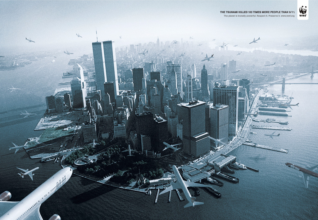 Este anuncio fue desarrollado por DDB Brasil para la WWF; en él se muestra a decenas de aviones dirigiéndose a las Torres Gemelas, en clara reminiscencia al 9/11. El copy señala «El Tsunami mató cien veces más personas que el 9/11. El planeta es brutalmente poderoso. Respeteemoslo. Preservémoslo.»