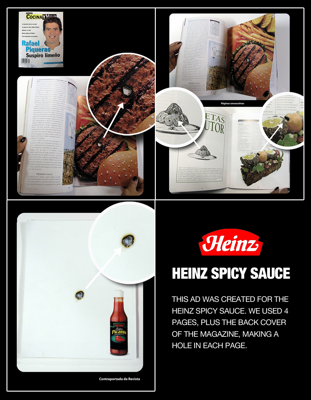Pues bien, sin importar lo anterior, se diseñó esta extraordinaria publicidad utilizando para ello las últimas cuatro páginas y la contraportada, generándoles un estratégico agujero para indicar el sitio donde había caído la picante salsa Heinz… en teoría, tan agresiva como para perforar la publicación.