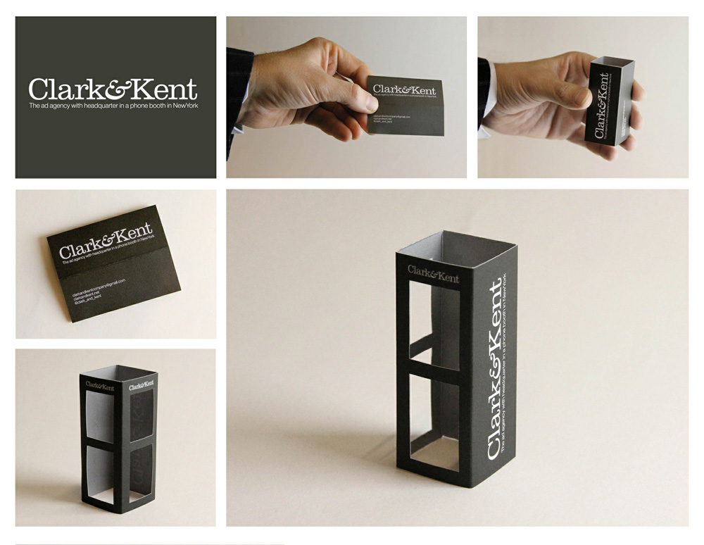 Para ejemplo de una buena tarjeta tenemos ésta de Clark&Kent. Aunque usted no lo crea, así se llama esta pequeña agencia de publicidad, que además convierte una debilidad en ventaja al asegurar que su agencia está efectivamente en una caseta telefónica. Obviamente, la tarjeta también guarda esta forma… ¿Y qué datos incluyen? Sólo la web, el mail y el twitter. ¡A esto me refiero!