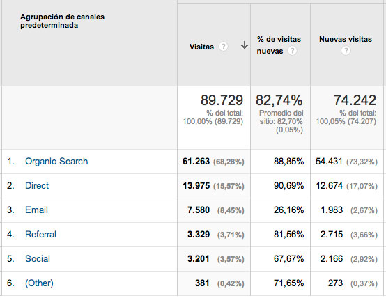 En los reportes básicos de Google Analytics también se pueden mirar canales, que no son otra cosa que agrupaciones básicas de fuentes y medios para entender de forma muy general cómo estamos adquiriendo tráfico. Te dejo la imagen de otro de los reportes básicos de Analytics (Canales) perteneciente a otro de nuestros clientes; en ella puedes ver los cinco tipos de tráfico principales. [tti link=» Twittea este dato»]Los 5 tipos de tráfico básicos: Orgánico, directo, email, social y de referencia.[/tti]