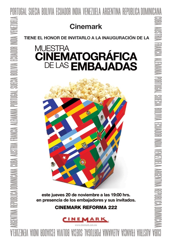 Un buen ejemplo de un recurso trillado pero que gracias a la reticencia del diseño y al acento en el colorido, logra una buena ejecución. El cartel es para la Muestra Cinematográfica de las Embajadas —un espacio para que el público mexicano conozca otras aristas de la filmografía como parte de la expresión cultural de cada pueblo representado—y el diseñador logra a través de una composición sencilla y objetiva, la estética y funcionalidad.