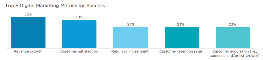 Ya que vimos qué canal produce más ROI, es momento de ver qué métrica es la más importante para señalar el éxito de una ejecución, y esta es: el crecimiento en ingresos, seguida de la satisfacción del cliente y del ROI.