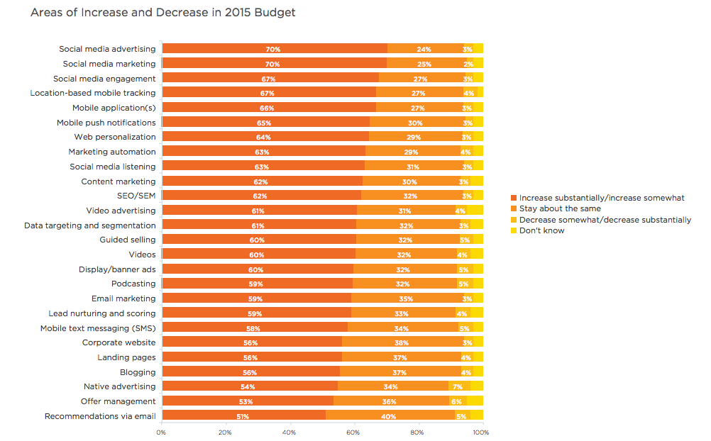 Sin embargo cuando se les pregunta en donde se invertirá más en el 2015, en vez de sugerir acciones como cualificar más a los contactos o explorar el marketing automation para eficientar aún más ese ROI del e-mail marketing, la gran mayoría se decantan por redes sociales, desde anuncios pagados hasta esfuerzos en engagement…