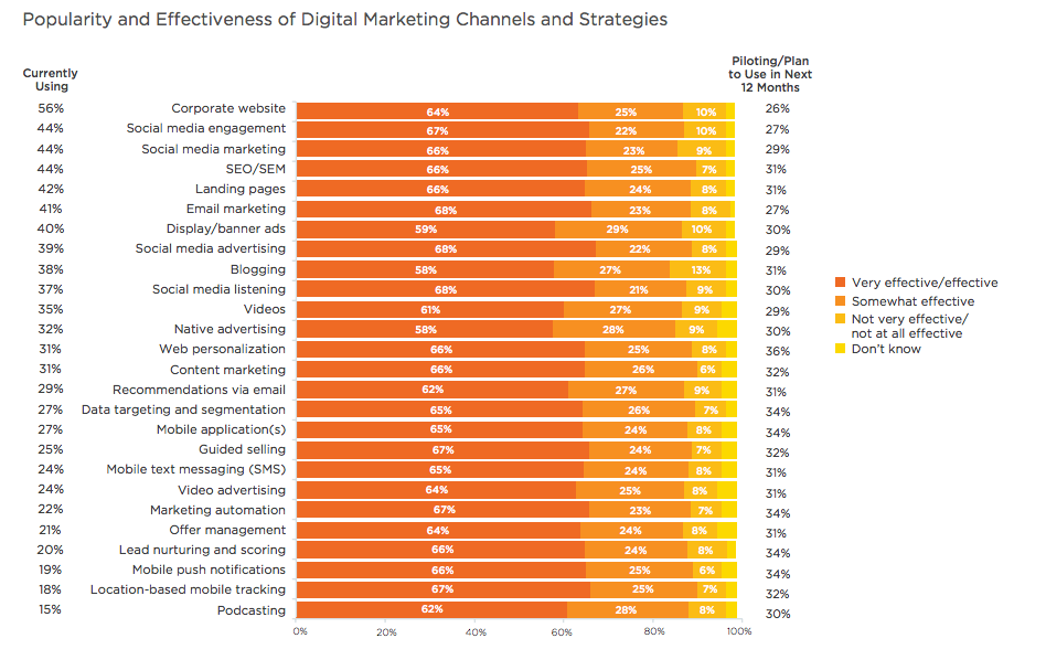 Se les preguntó también sobre los canales que les resultaban más populares y efectivos… Los tres ganadores fueron: social media listening, social media advertising y el e-mail marketing con 68% cada uno. Como podemos ver, a pesar de los datos duros del ROI, la fascinación por lo social sigue siendo muy fuerte.