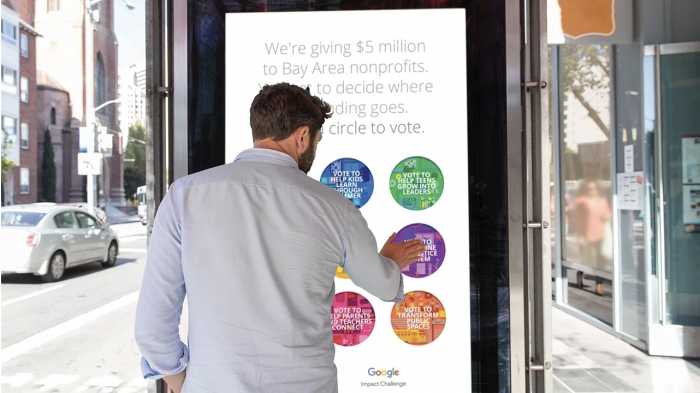 Para que los miembros del Área de la Bahía participaran en el proceso, Google instaló carteles interactivos en todo San Francisco que servían como casillas de votación públicas. Cada póster mostraba las 10 organizaciones sin fines de lucro y la causa principal que cada una intentaba abordar.