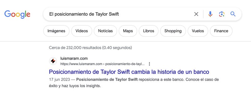 Y en nuestro propio sitio, creamos el contenido «El posicionamiento de Taylor Swift«, colocándolo en el No.1 de Google solo por debajo del fragmento sugerido del buscador.