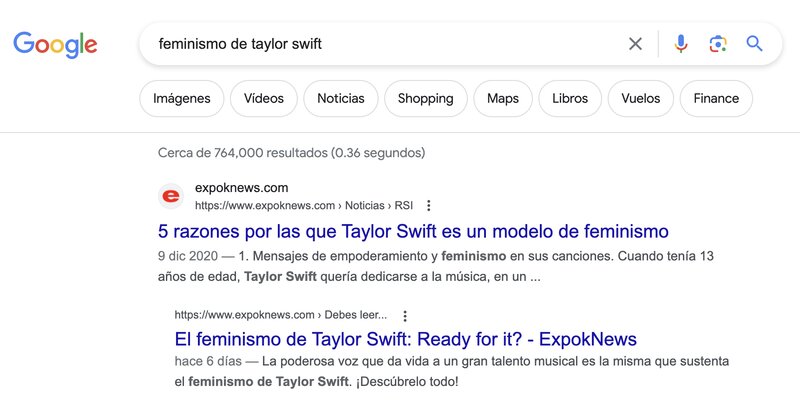 Finalmente nosotros mismos hicimos lo propio. A uno de nuestros clientes, Expok, que se dedica a la asesoría de responsabilidad social le desarrollamos el contenido «El feminismo de Taylor Swift«, que logramos colocar en el No. 1 de Google con esa keyword.