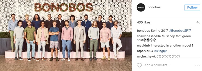Ejemplos de mala descripción en Instagram por Bonobos. Tener solo 2 palabras y un hashtag en la descripción como en el caso de Bonobos no es buena idea.