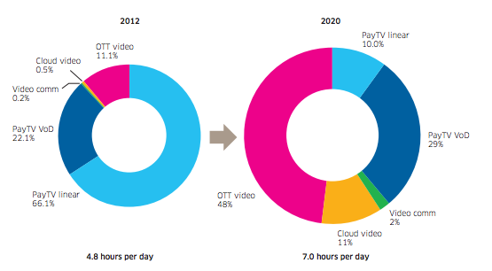 • El tiempo total dedicado a ver video pasará de 4,8 horas a 7 horas por usuario, por día. La mayoría de esta contribución procederá de consumidores de última generación más proclives a la multitarea –ver la televisión mientras hacen una video llamada en su tablet– lo cual resultará en un equivalente de siete horas de video consumidas en un período de cinco horas.